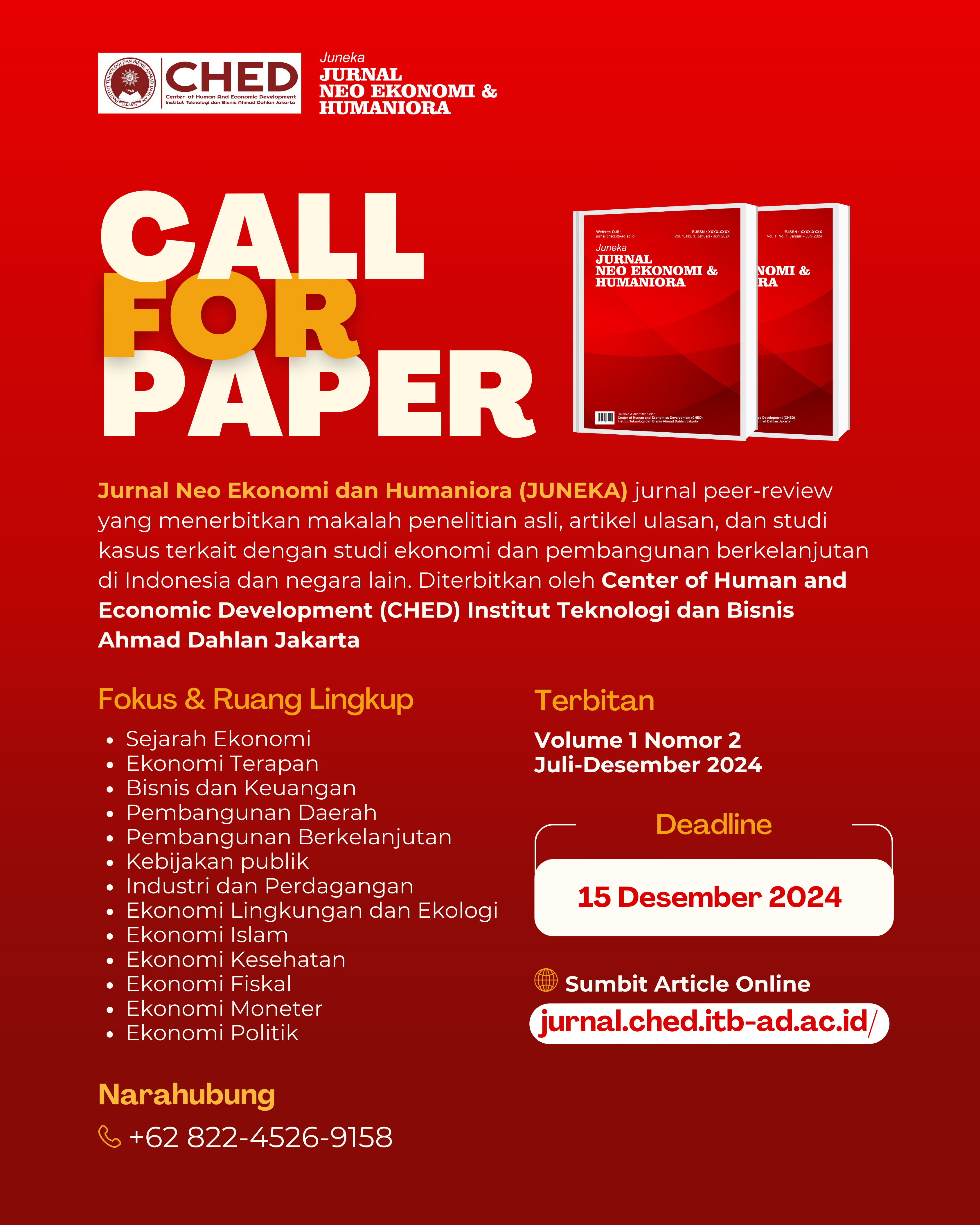 Jurnal Neo Ekonomi dan Humaniora (JUNEKA), jurnal ilmiah yang terbit dua kali dalam setahun dan telah melalui proses peer-review, mengundang kontribusi artikel dari para akademisi, peneliti, dan praktisi di bidang ekonomi dan pembangunan berkelanjutan.